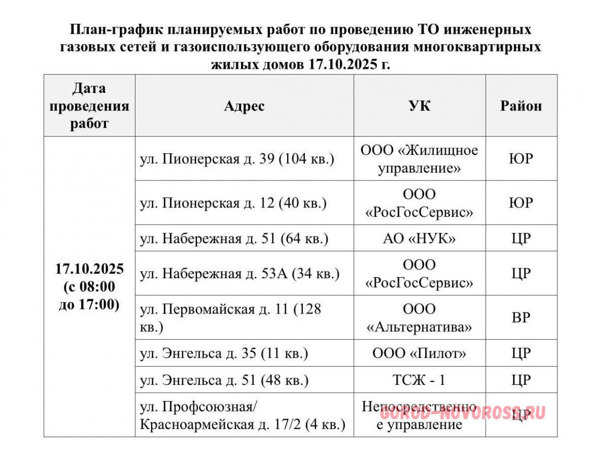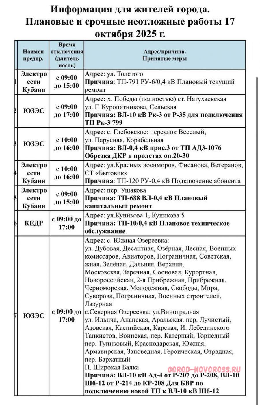 Информация о плановом и срочном отключении электроэнергии и и газоснабжения в Новороссийске 17.10.2025 предоставлена МБУ «Безопасный город».