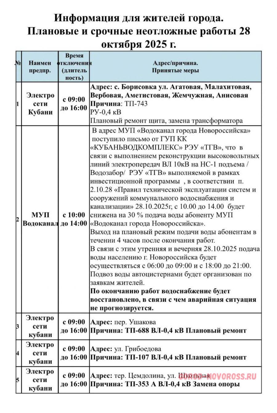 Информация о плановом и срочном отключении электроэнергии и и газоснабжения в Новороссийске 28.10.2025 предоставлена МБУ «Безопасный город».