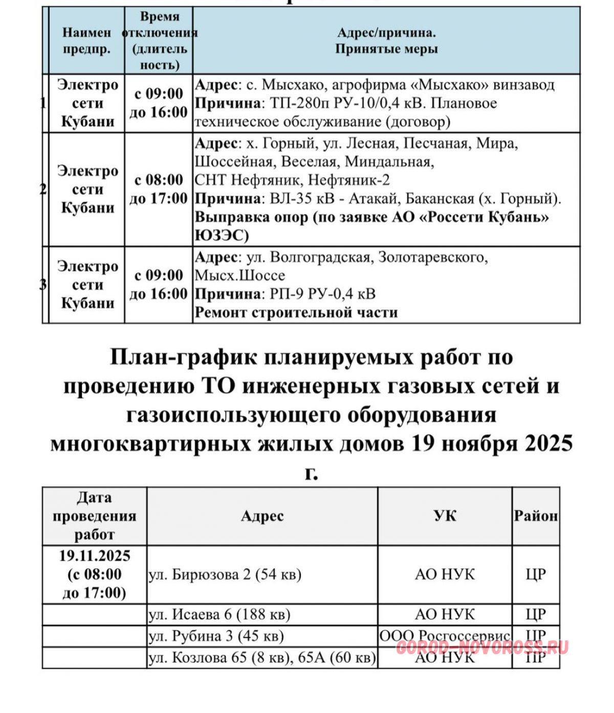 Информация о плановом и срочном отключении электроэнергии и и газоснабжения в Новороссийске 19.11.2025 предоставлена МБУ «Безопасный город».