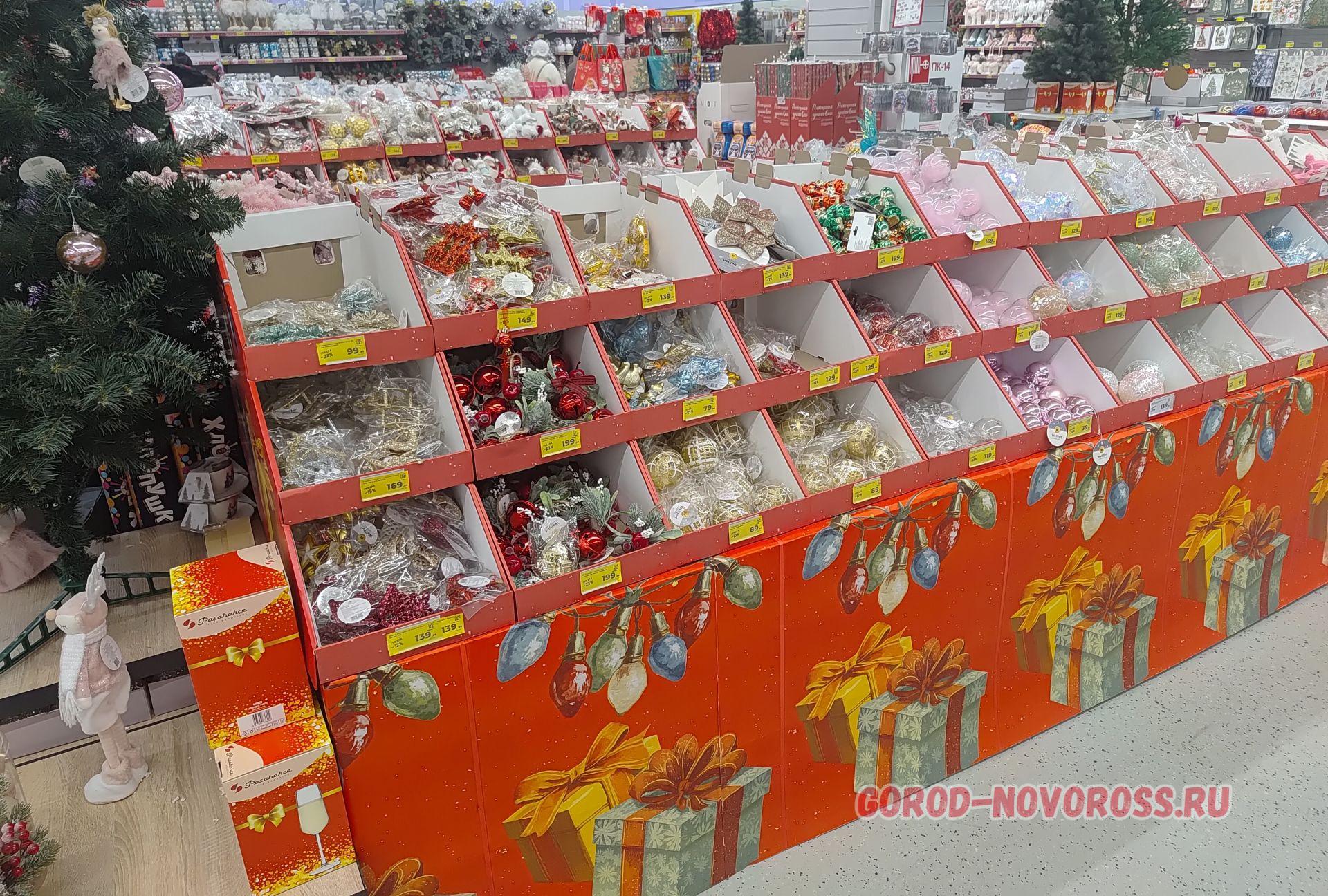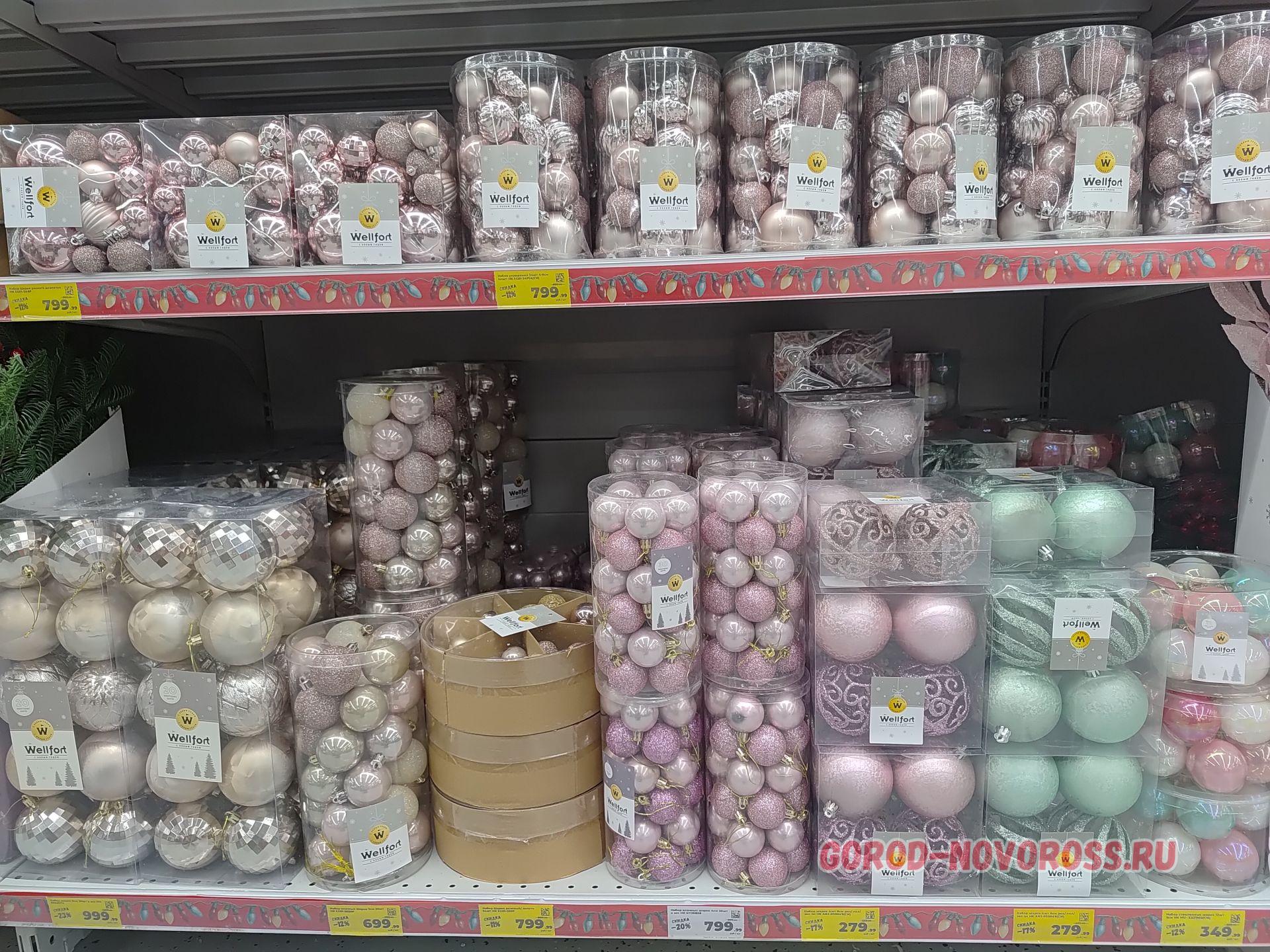 В более дорогой торговой сети пластмассовые игрушки, оригинальные и креативные, продаются по цене от 150 рублей и то по акции. Также по акции можно купить небольшие шарики с блестками за 175 рублей. Но в основном стоимость украшений выше – молочно-белые звезды и елочки в золотистом обрамлении предлагают более, чем за 300 рублей, а грибы в золотистом чешуйчатом покрытии стоят 455 рублей.