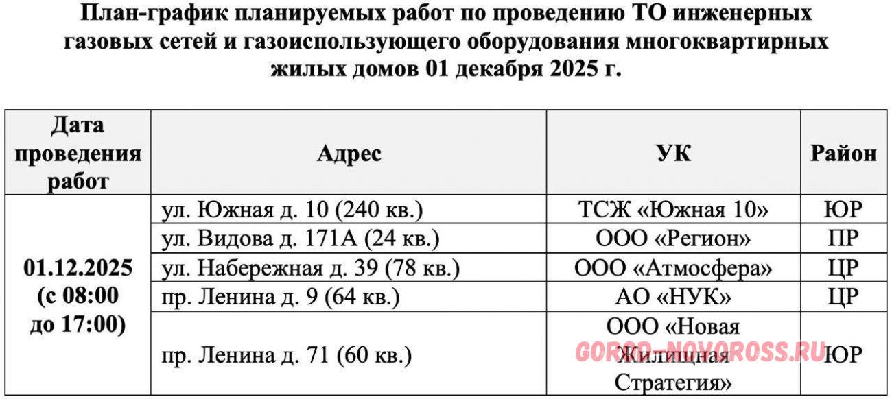 Плановое и срочное отключение электро- и газоснабжения в Новороссийске 01.12.2025