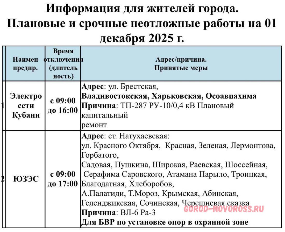 Информация о плановом и срочном отключении электроэнергии и и газоснабжения в Новороссийске 01.12.2025 предоставлена МБУ «Безопасный город».