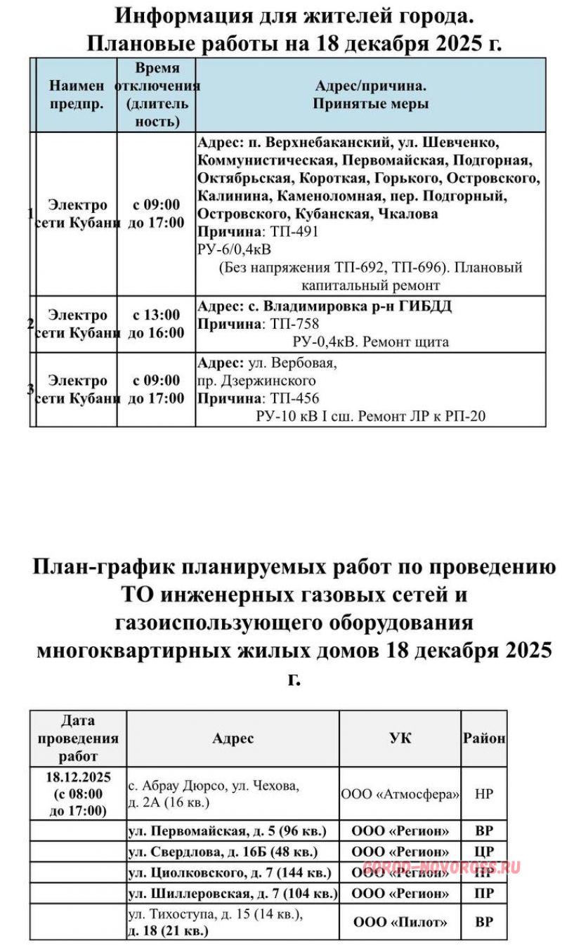 Информация о плановом и срочном отключении электроэнергии и и газоснабжения в Новороссийске 18.12.2025 предоставлена МБУ «Безопасный город».