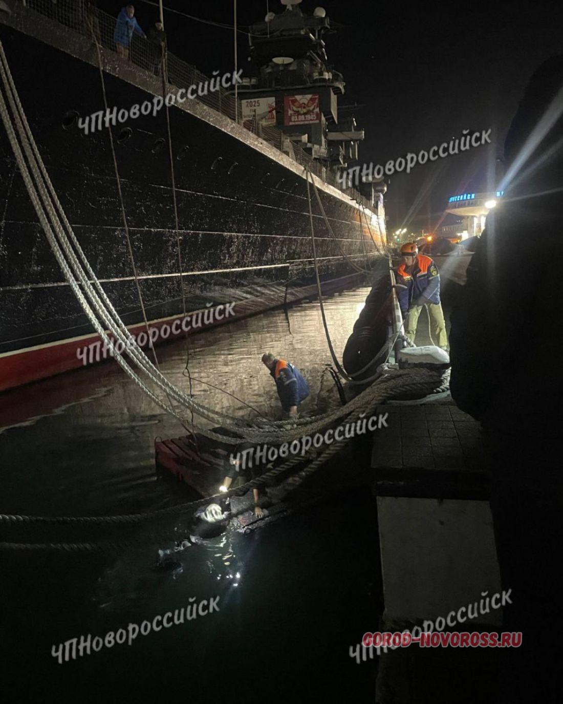 Женщина упала в воду возле носа «Кутузова», там зацепилась за швартовые канаты, лежала и звала на помощь.