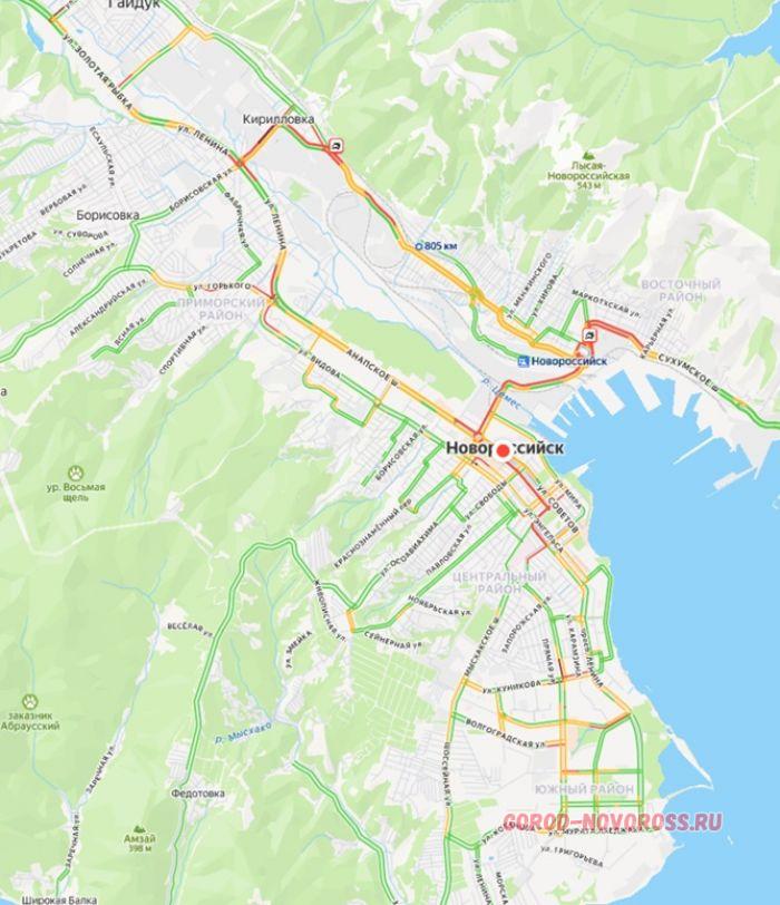 С пробками в Новороссийске ничего не меняется. Традиционно в «бордовый» и «алый» цвета окрасились улицы: Кооперативная, Лермонтова, Магистральная, Судостальская, Робеспьера, Сакко и Ванцетти, Советов, Московская, пр-д Скобликова, Лейтенанта Шмидта, Цедрика, Грибоедова, Энгельса, Анапское шоссе, ул. Ленина, Новороссийское шоссе, перекрёсток в Приморском районе на АЗС «Лукойл». Сегодня пробок, по сравнению со вчерашним вечером, как будто бы меньше.