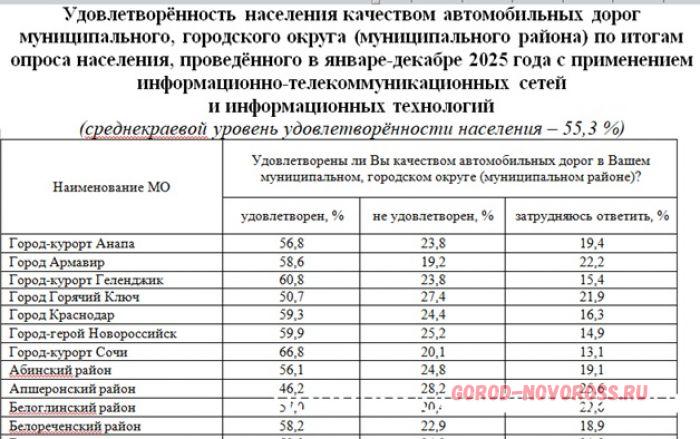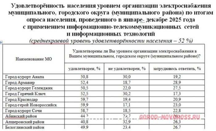 На сайте администрации Краснодарского края опубликованы итоги опроса населения об эффективности деятельности руководителей органов местного самоуправления муниципалитетов края, унитарных предприятий и учреждений, оказывающих услуги населению за декабрь 2025 и январь текущего года.
