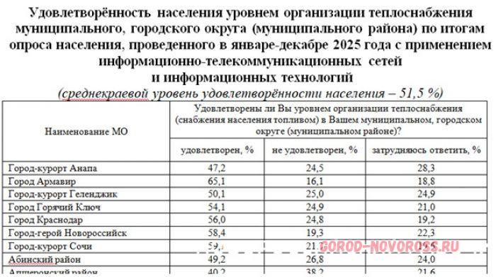 Уровень удовлетворенности новороссийцев организацией теплоснабжения составил 58,4% — это выше среднего. Для сравнения, самые довольные в этом отношении люди живут в Армавире (65,1%). Хуже всего, согласно опросу, обстоят дела в Северском районе (37%).