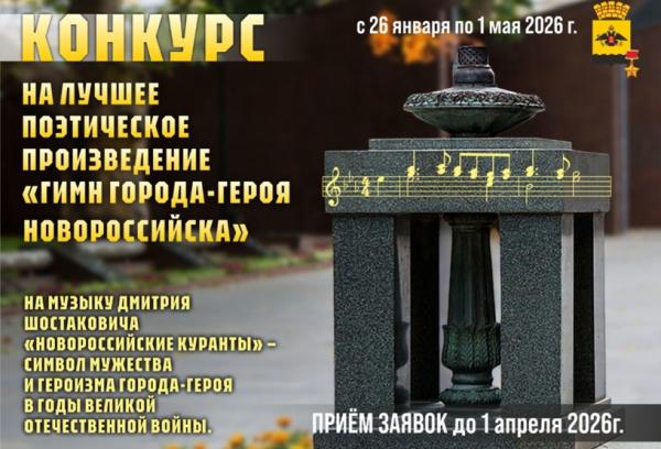 Уважаемые жители города-героя Новороссийска! С 26 января по 1 мая 2026 года администрация Новороссийска проводит конкурс на лучшее поэтическое произведение «Гимн города-героя Новороссийска», которое...