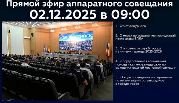 Уважаемые жители города-героя Новороссийска!2 декабря в 09:00 в администрации муниципального образования город-герой Новороссийск начнется очередное аппаратное совещание.Присоединиться к обсуждению ва...