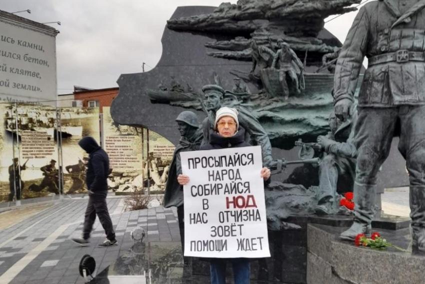 У памятника… вернее, практически НА памятнике Цезарю Куникову 77-летняя Лариса Ларина (Измайлова) провела, как она пишет, акцию «Вставай, страна огромная». На плакате, который она держала обеими руками, чёрным по белому было написано: «Просыпайся народ/собирайся в НОД/нас Отчизна зовёт/помощи ждёт».