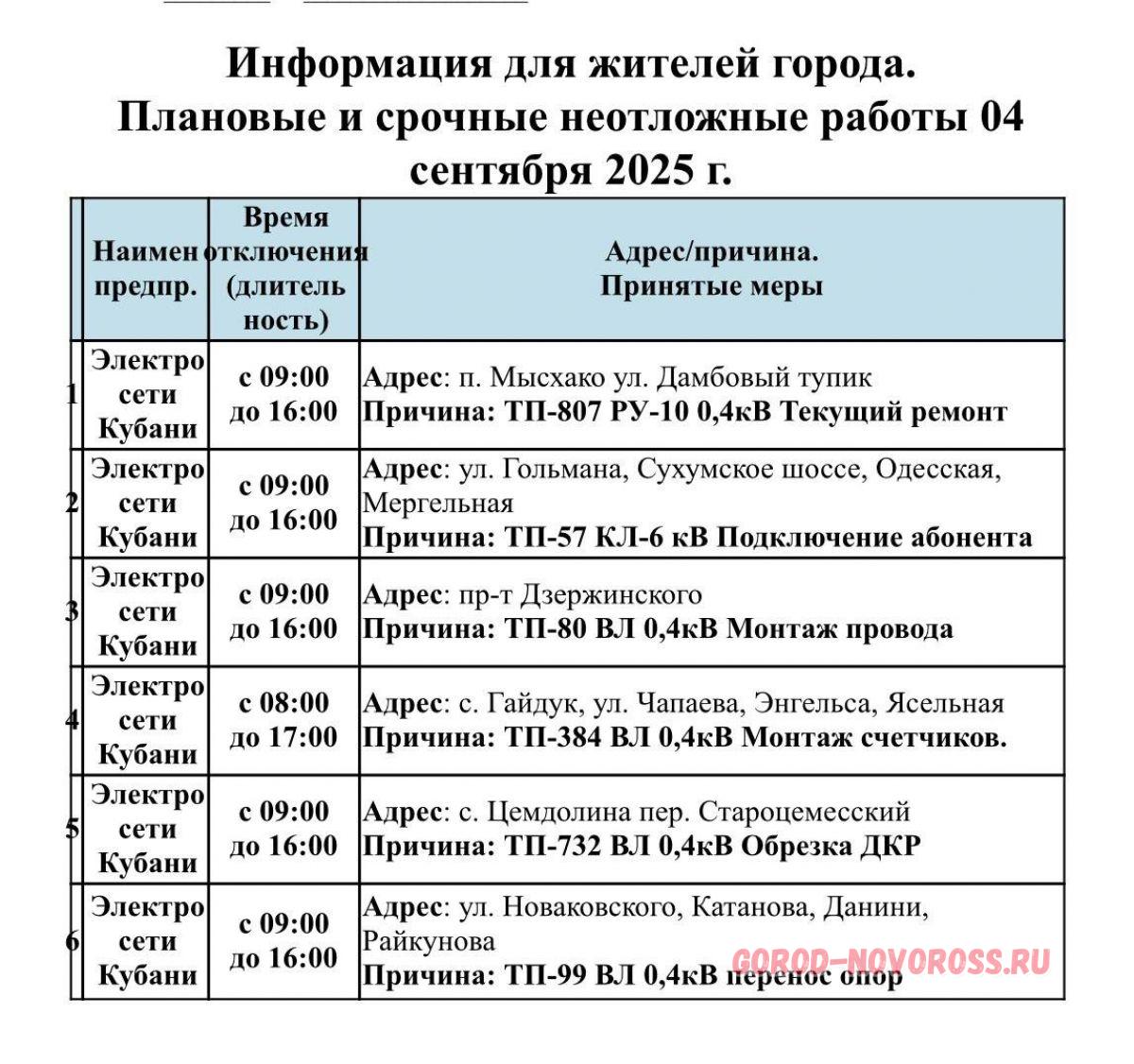 Информация о плановом и срочном отключении электроэнергии и и газоснабжения в Новороссийске 04.09.2025 предоставлена МБУ «Безопасный город».