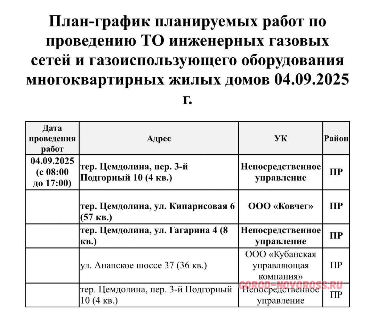 Плановое и срочное отключение электро- и газоснабжения в Новороссийске 04.09.2025