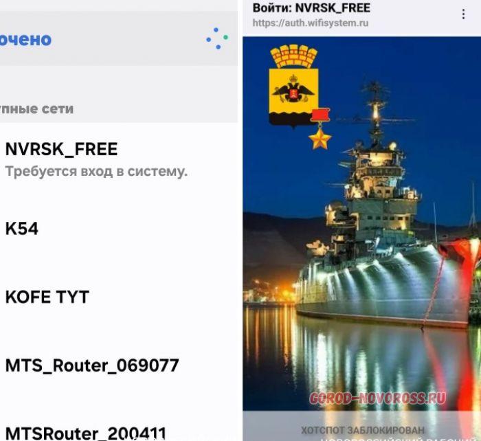 Двое молодых людей, ожидавших троллейбус, подсказали, что та самая сеть, которая предусмотрена разработчиками «умной» остановки скорее всего называется NVRSK_FREE. Она приглашала войти в систему без всяких условий. После клика предстала красивая картинка с гербом города-героя, крейсером «Михаил Кутузов» и надписью «Хотспот заблокирован». То есть, когда-то тут предоставляли вай-фай, но не теперь.