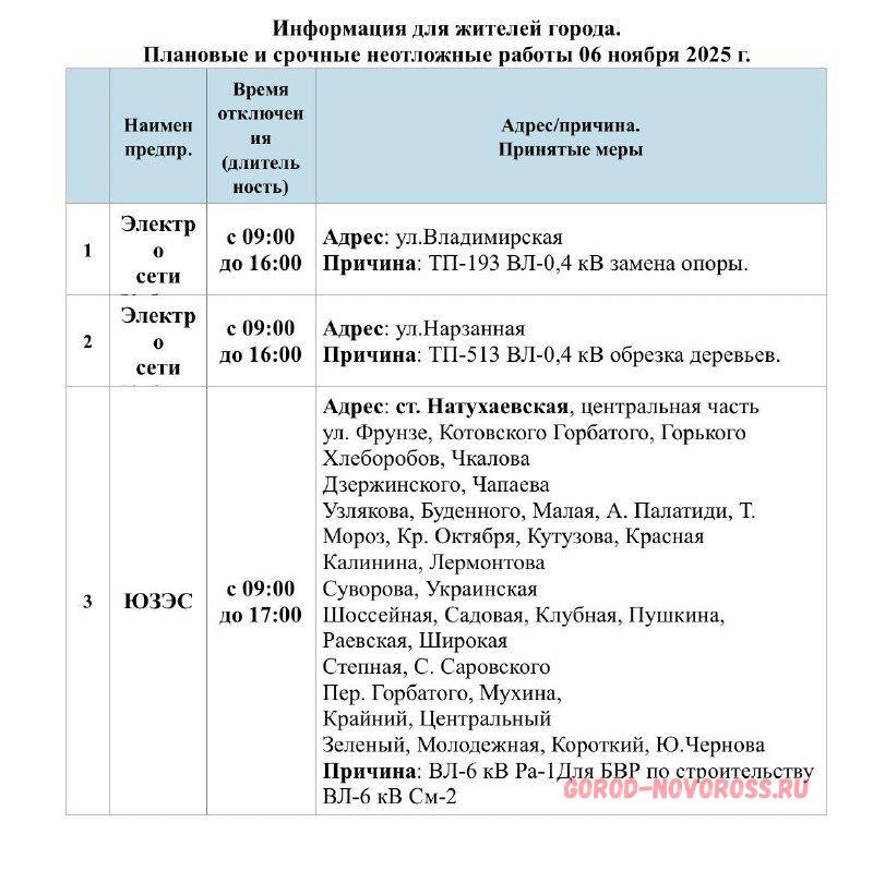 Информация о плановом и срочном отключении электроэнергии и и газоснабжения в Новороссийске 06.11.2025 предоставлена МБУ «Безопасный город».