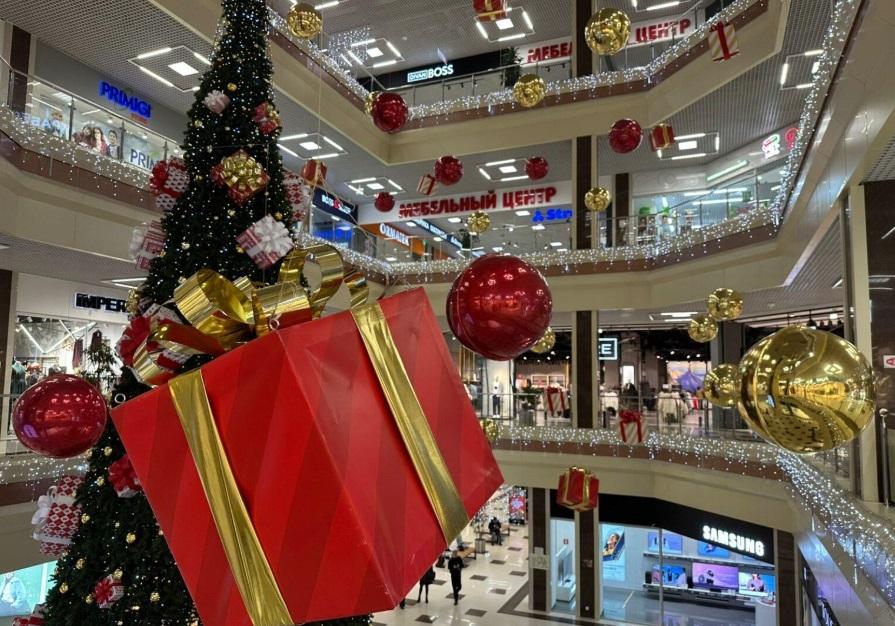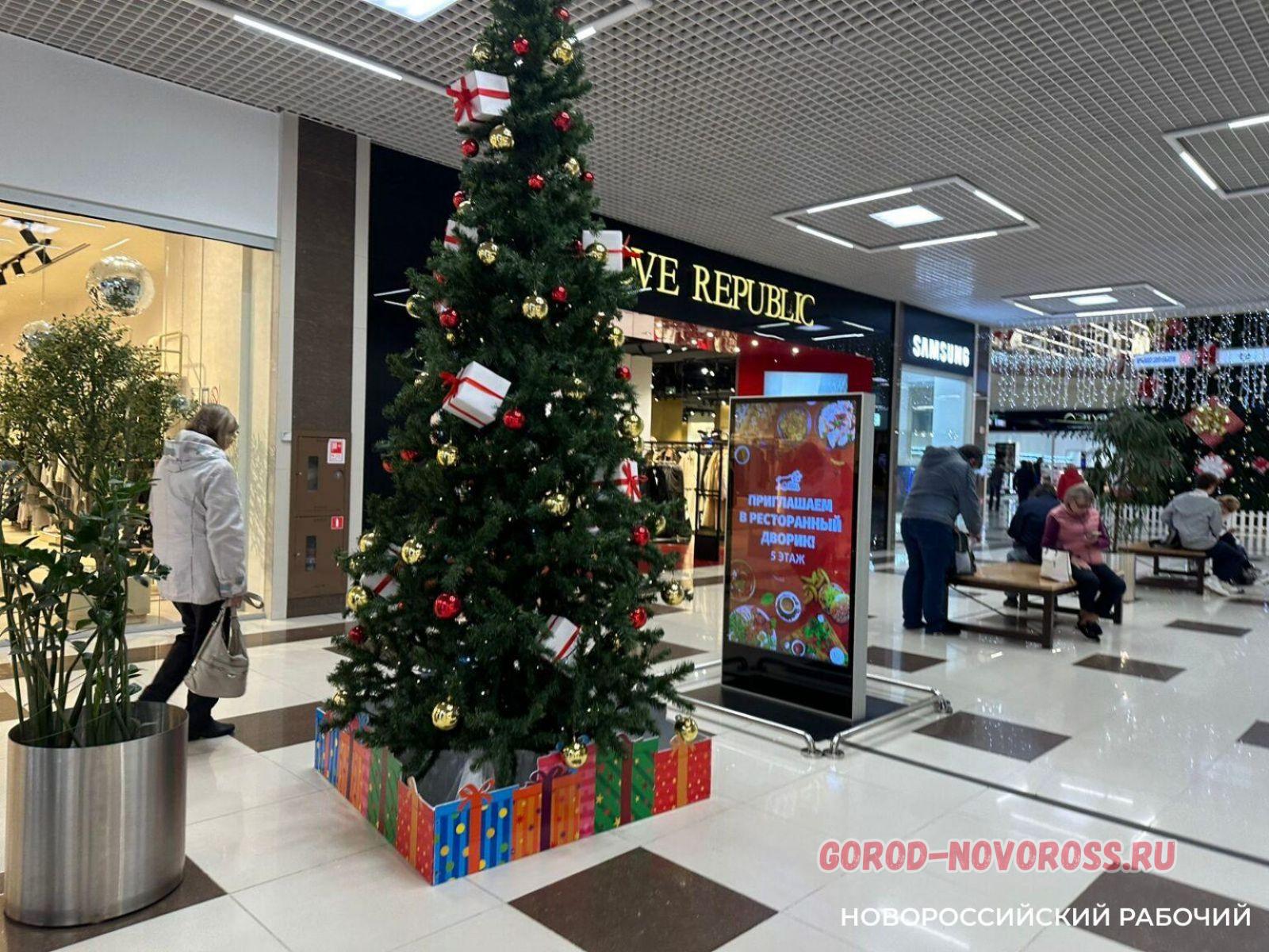 ТЦ «Красная площадь» уже установила елки в первой и второй очереди. Они украшены блестящими шарами, подарочными коробками, елочными игрушками из мишуры и гирляндами.