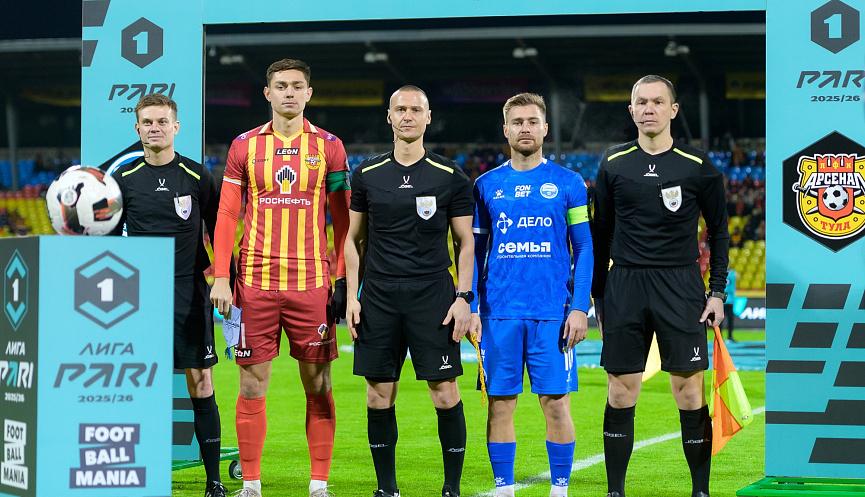 «Арсенал» (Тула) – «Черноморец» (Новороссийск) 1:1 (0:0) Голы: Алиев (с пенальти), 62 - 0:1, Мирзов (Пенчиков, Алинви), 86 - 1:1 «Арсенал»: Цулая, Попов, Большаков (к), Ботака, Пенчиков, Раздорских, Цараев (Алинви, 63), Брнович (Азявин, 73), Мирзов, Горбунов (Липовой, 63), Калмыков (Максимов, 73) «Черноморец»: Штепа, Пузанов, Сыщенко, Кирш, Николаев, Зарыпбеков, Тарба, Родионов (Гурченко, 82), Жигулев (к), Антонов (Плиев, 90+3), Алиев (Сутугин, 77 (Кухарчук, 90+3) Предупреждения: Большаков (22), Жигулев (25), Кирш (32), Зарпыбеков (65), Щтепа (83), Максимов (83), Тарба (83) Судьи: Лапатухин Алексей (Москва), Линкин Алексей (Воронеж), Щербаков Степан (Омск) 22.11.2025, Тула, стадион «Арсенал», 2373 зрителя, +2 градуса Удары (в створ): 12(4):9(2) Угловые: 8:5 Голевые моменты: 3:3 Тульский «Арсенал» в последних четырех турах одержал четыре победы и рассчитывал поживиться тремя очками в домашнем матче против «Черноморца». Главный тренер хозяев поля Дмитрий Гунько вынужден был пойти на перестановки в средней линии из-за травмы Александра Трошечкина, но равноценного состава у туляков на целых две команды. Считать Никиту Раздорских или Алана Цараева игроками запаса вряд ли кто-то станет. К тому же вернулся из сборной еще один основной хавбек «Арсенала» Милош Брнович. Вернулся в основу лучший бомбардир команды Амур Калмыков, который в предыдущем матче выходил на замену в концовке встречи. У новороссийской команды, которая добиралась до Тулы на двух автобусах, в отель из молодежной сборной подъехали два Ильи – Кирш и Родионов. По итогу оба оказались в основном составе, а в остальном все, кто вышел на естественный газон стадиона «Арсенал» были понятны задолго до начала матча. Потерей стало отсутствие Кирилла Морозова, которому после игры с «Волгой» сделали операцию по удалению аппендицита. Начало встречи неожиданно осталось за гостями. «Арсенал» растерялся от такой прыти соперника. Уже на 3-й минуте Заур Тарба, здорово развернувшись на фланге, ворвался в штрафную, но его передачу заблокировали. После углового тот же Заур Тарба пробил выше ворот. Хозяева ответили своим угловым. Удар Милоша Брновича пришелся в защитников «Черноморца». Легионер «Арсенала» раз за разом оказывался на ударной позиции, но ему не хватало точности. На 17-й минуте возможность для удара предоставилась Резиуану Мирзову. И снова мяч прилетел в защитника «Черноморца». «Арсенал» нащупал свою игру, прижав гостей к штрафной, и вот в этот момент Саид Алиев заработал штрафной метрах в двадцати пяти от ворот. Бить вызвался Илья Кирш, но неожиданно откатил влево на Максима Сыщенко, который такого подарка от партнера не ожидал. Туляки перехватили мяч, убежали в контратаку, и только своевременный выход из ворот Михаила Штепы не позволил Резиуану Мирзову добраться до мяча после проникающей передачи в штрафную от Игоря Горбунова. Через несколько минут в штрафной хозяев поля упал Илья Родионов, но главный арбитр Алексей Лапатухин показал, что нарушения правил не было. В концовке первого тайма блеснул своей реакцией Михаил Штепа. Голкипер «Черноморца» в эффектном прыжке перевел мяч на угловой после красивейшего удара со штрафного от Милоша Брновича. В перерыве ни один из тренеров перестановок делать не стал. Игра продолжилась в том же ключе, что и в первом тайме. Обе команды атаковали попеременно, минут по пять владея мячом. На 57-й минуте Илья Кирш все-та