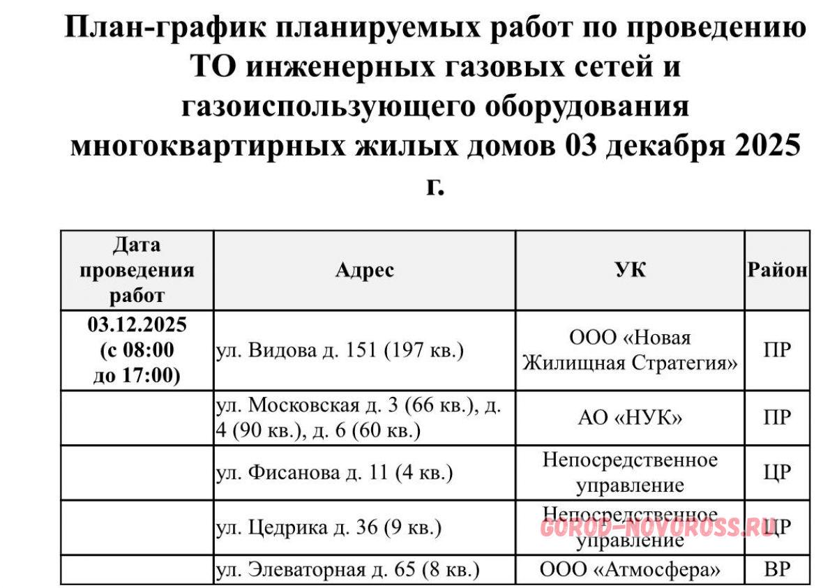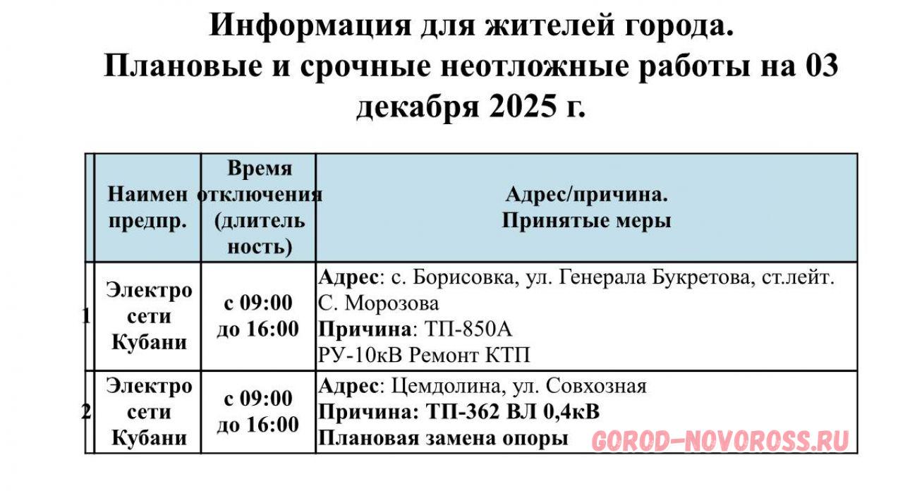 Информация о плановом и срочном отключении электроэнергии и и газоснабжения в Новороссийске 03.12.2025 предоставлена МБУ «Безопасный город».