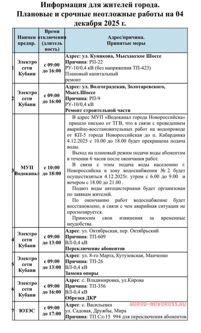 Информация о плановом и срочном отключении электроэнергии и и газоснабжения в Новороссийске 04.12.2025 предоставлена МБУ «Безопасный город».