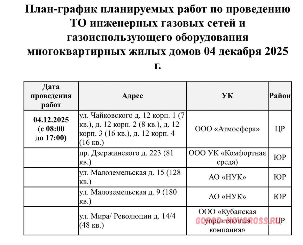 Плановое и срочное отключение электро- и газоснабжения в Новороссийске 04.12.2025