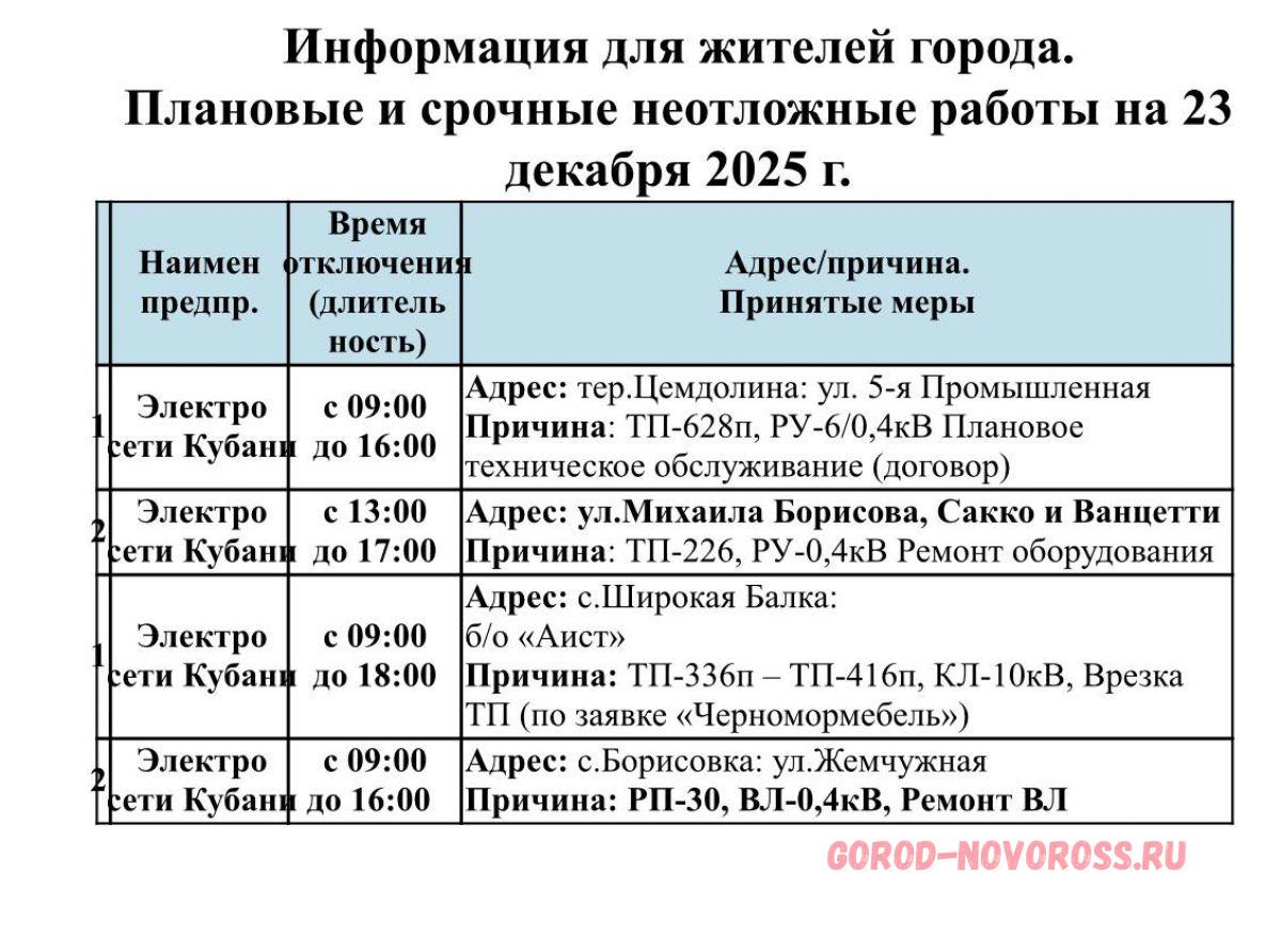 Информация о плановом и срочном отключении электроэнергии и газоснабжения в Новороссийске 23.12.2025 предоставлена МБУ «Безопасный город».
