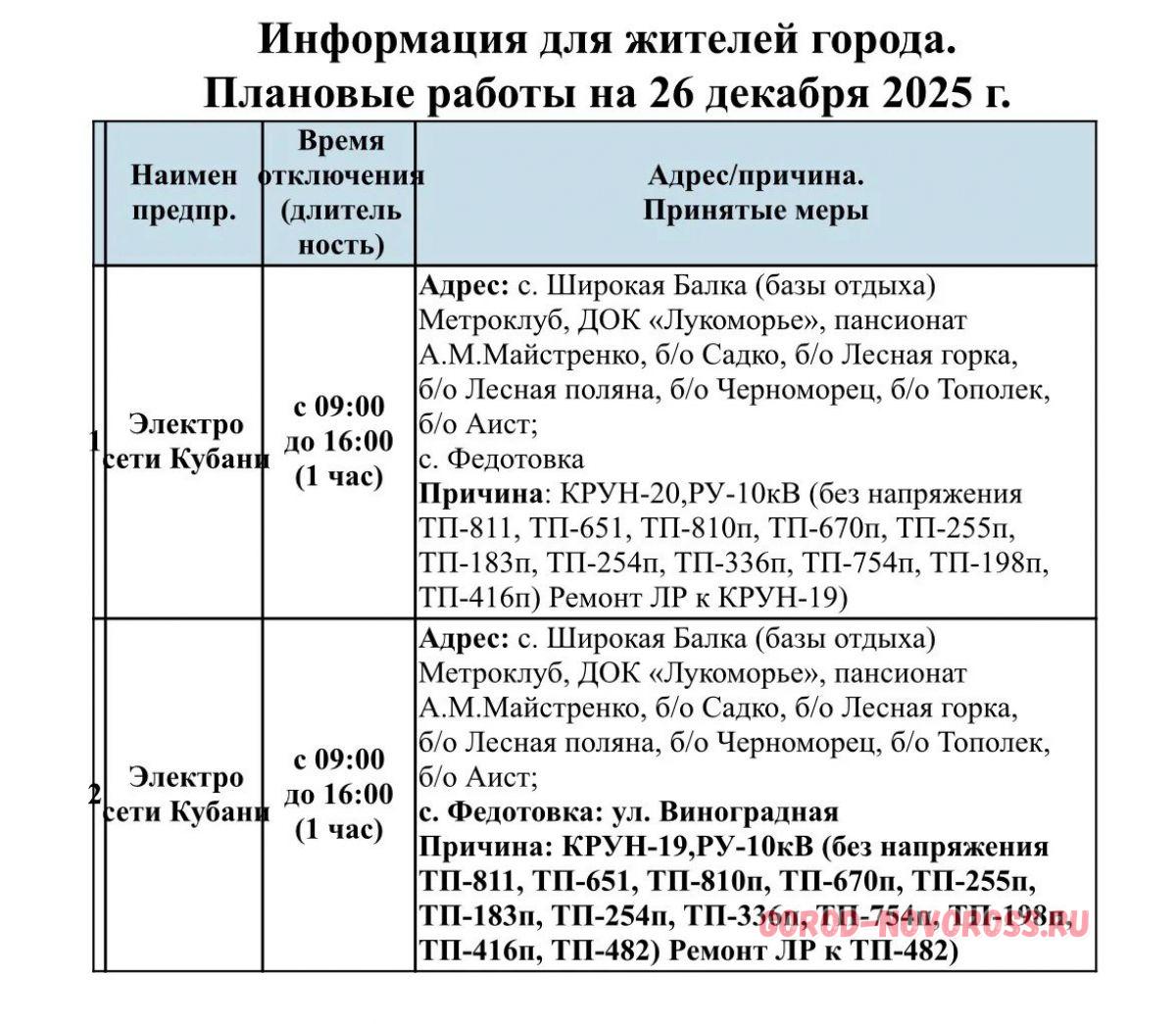 Информация о плановом и срочном отключении электроэнергии в Новороссийске 26.12.2025 предоставлена МБУ «Безопасный город».