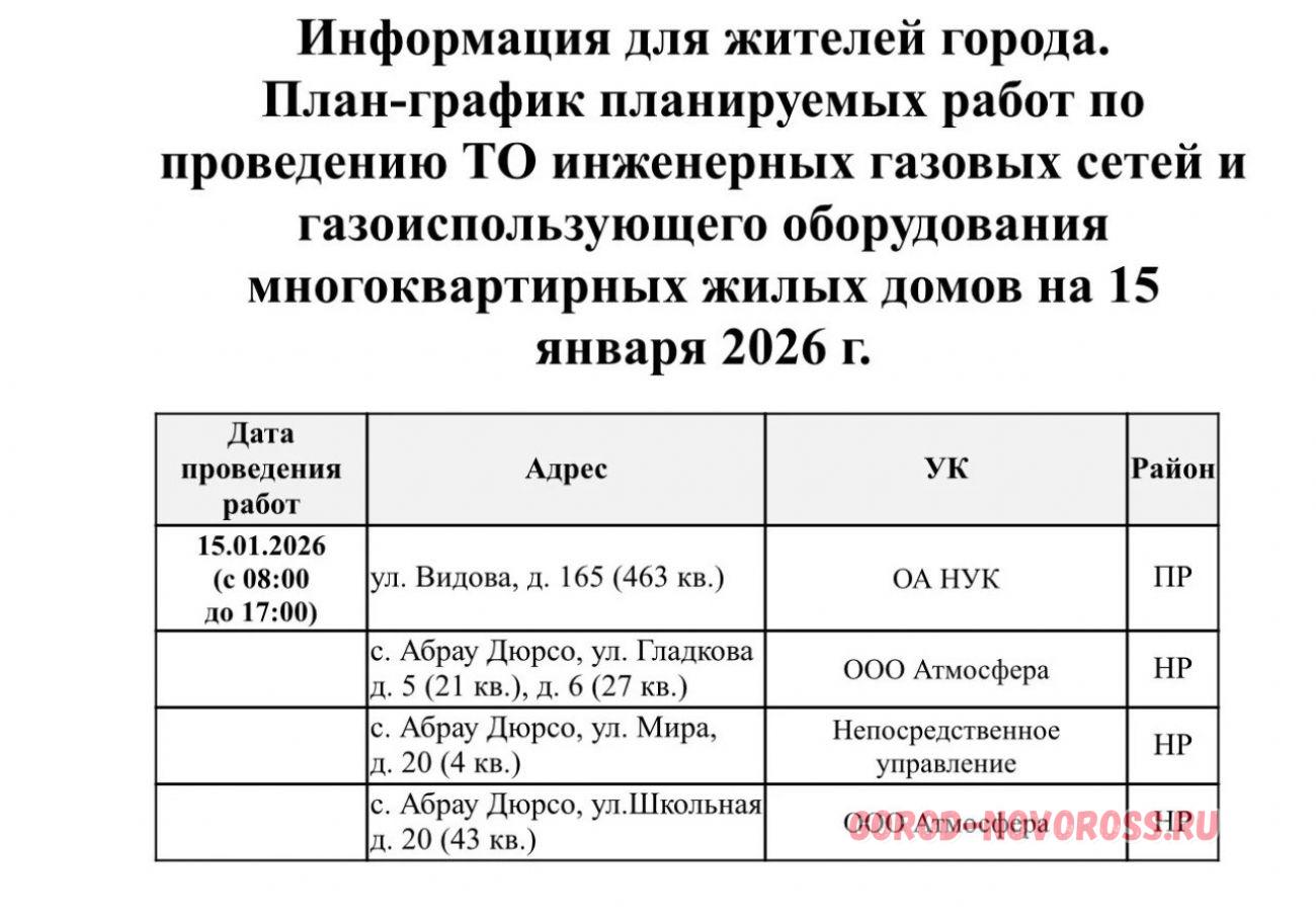 Информация о плановом и срочном отключении газоснабжения в Новороссийске 15.01.2026 предоставлена МБУ «Безопасный город».