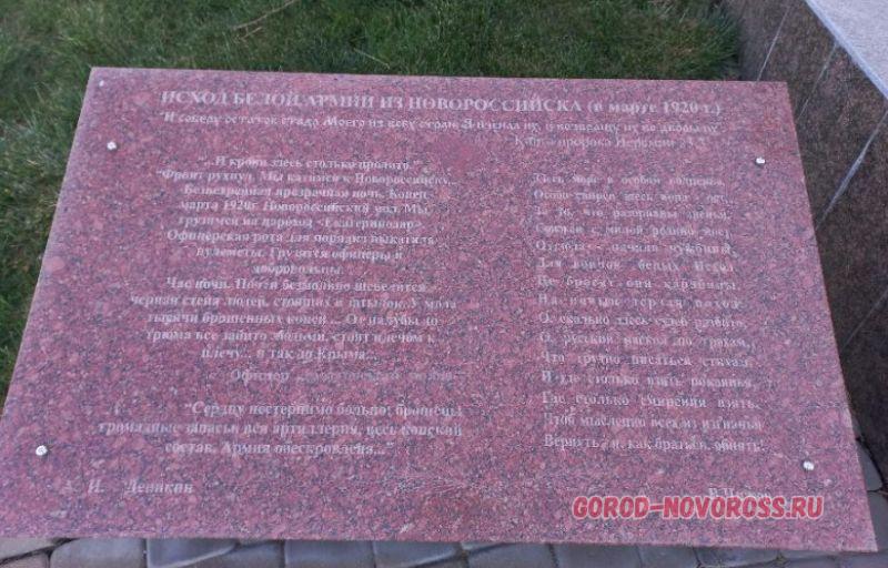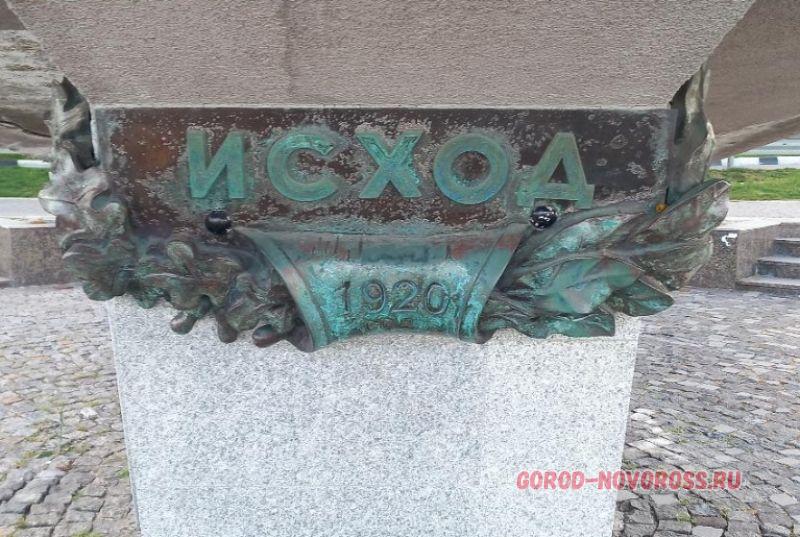 В память об этих трагических событиях 12 апреля 2013 года на набережной Новороссийска был установлен памятник «Исход», созданный новороссийским художником Александром Суворовым, который также является автором других памятных мест города.Памятник установлен на месте, откуда остатки белых войск покинули родину. Рядом с памятником установлены мемориальные плиты с названиями воинских подразделений царской армии, эвакуировавшихся в Крым, Константинополь, Лемос и другие места, а также слова из книги пророка Иеремии 23.3 «И соберу остаток стада Моего из всех стран. Я изгнал их, и возвращу их во дворы их».