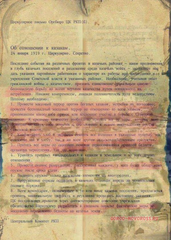Именно 24 января 1919 года был подписан циркуляр, положивший начало массовому уничтожению русского казачества как сословия. Репрессии Советской власти коснулись практически каждой казачьей семьи, поскольку казаки, давшие присягу «За Веру, Царя и Отечество», не принимали сторону новой власти, отказавшейся от веры и православия.