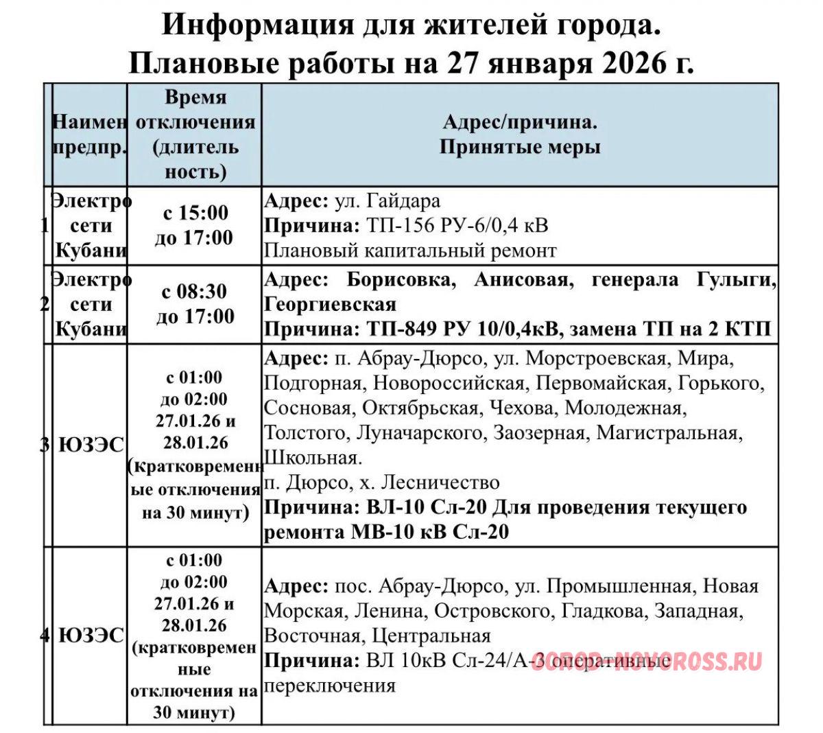Информация о плановом и срочном отключении электроэнергии в Новороссийске 27.01.2026 предоставлена МБУ «Безопасный город».