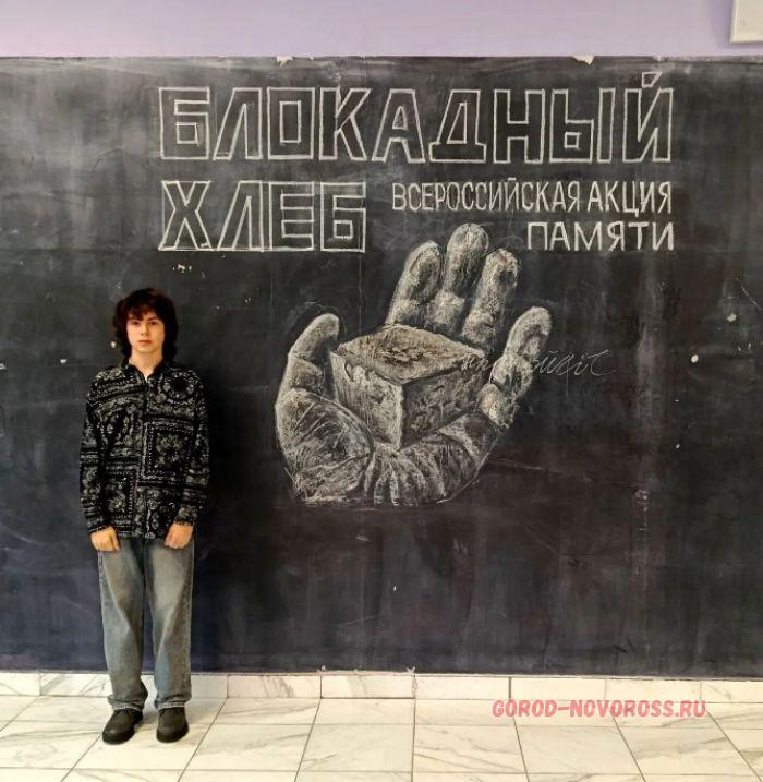 27 января по всей стране вспоминают героев блокадного Ленинграда, в Новороссийске прошла традиционная акция «Блокадный хлеб». А юные художники из школы №34 представили новую картину, выполненную мелками на школьной доске. На ней рука человека, в которой лежит кусочек блокадного хлеба.