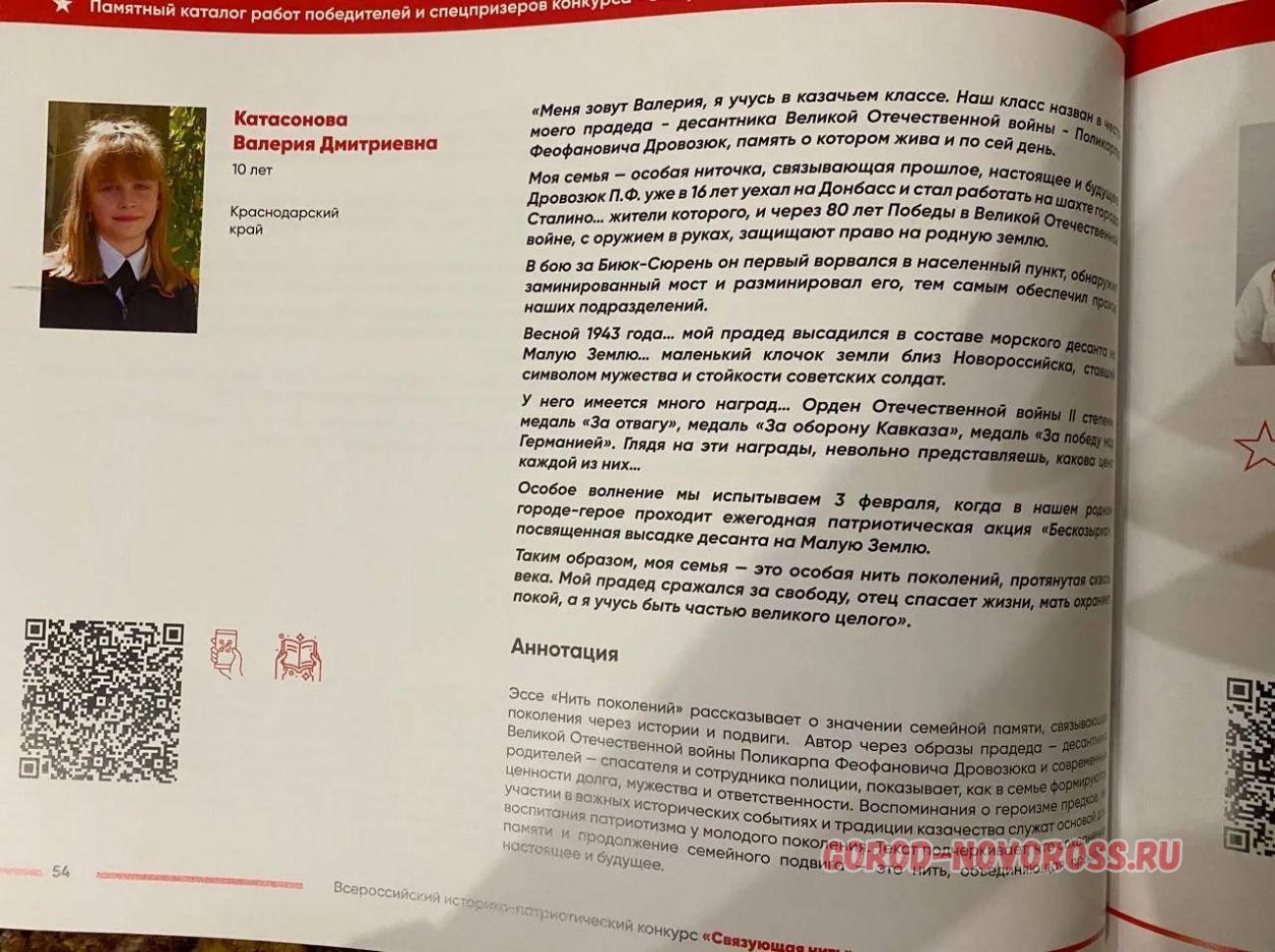Валерия в своём эссе «Нить поколений» рассказала о значении семейной памяти, сквозь призму судеб прадеда-десантника, участника легендарной обороны Малой Земли в годы Великой Отечественной войны, Поликарпа Феофановича Дровозюка, и сегодняшних героев в погонах – родителей Валерии, спасателя и сотрудника полиции.