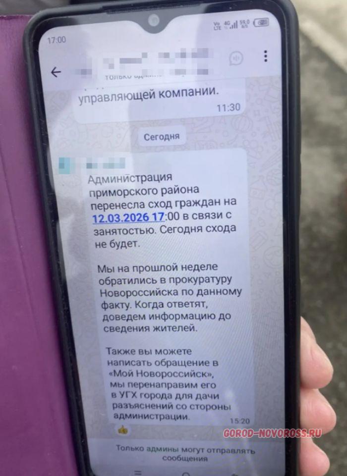 – Администрация Приморского района перенесла сход граждан на 17:00 12 марта 2026 года в связи с занятостью. На прошлой неделе мы обратились в прокуратуру Новороссийска по данному факту. Также вы можете написать обращение в «Мой Новороссийск», – оповестили граждан представители местной УК в «зеленом» приложении.