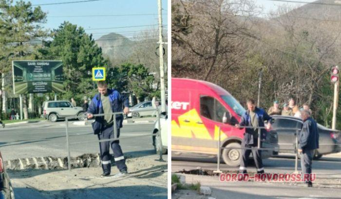 Вчера эту яму, на которую горожане жаловались несколько месяцев, начали ремонтировать. Теперь она стала еще шире и глубже и огорожена. Заодно рядом на перекрестке ремонтируют еще один участок, там тоже глубоко. И это – сужение из-за ограничения движения по правой полосе у самого перекрестка на Анапском шоссе при въезде в город.